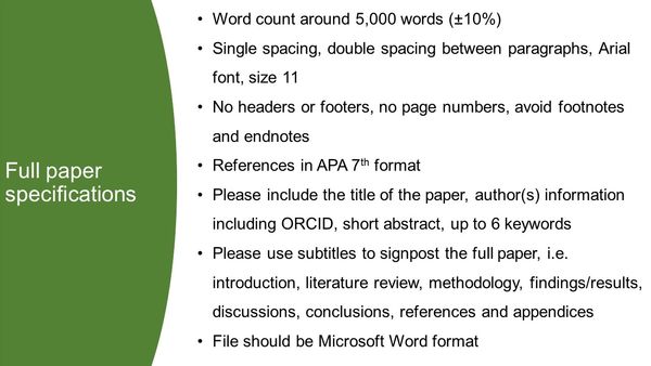Authors are encouraged to submit an abstract of 500 words, excluding references as early as possible. Each submitted work will go through a review process by the Scientific Committee to ensure quality and adherence to the conference theme. All references should be in APA format. All papers and presentations in English language only. There is no need to define sections or subsections in the abstract but as a whole the abstract should include the following: